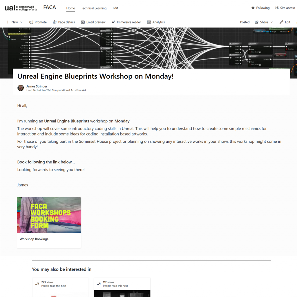 Your storytelling around the software you are using is skilful in filling out the learning contexts for the student. You connect this morning’s workshop to the previous introductory one, and the notes around C++ and the visual scripting brings the session into focus – it helps them see and understand the design of their learning, really good. The story about working with the artist using quantum computing is interesting. It reminds me that we are often reticent about discussing our own practice – it can feel self-centred, or marginal. But actually, it helps locate the lesson-learning in everyday life, it can help the students identify with stories of difficulty, failure and success. You did Fine Art at one of the best schools in the world and became a music producer and someone highly skilled in the latest technologies, software and hardware. You probably do this already James, but if not I think it is worth thinking about how to extract lesson examples (parables) from our own professional experiences.
