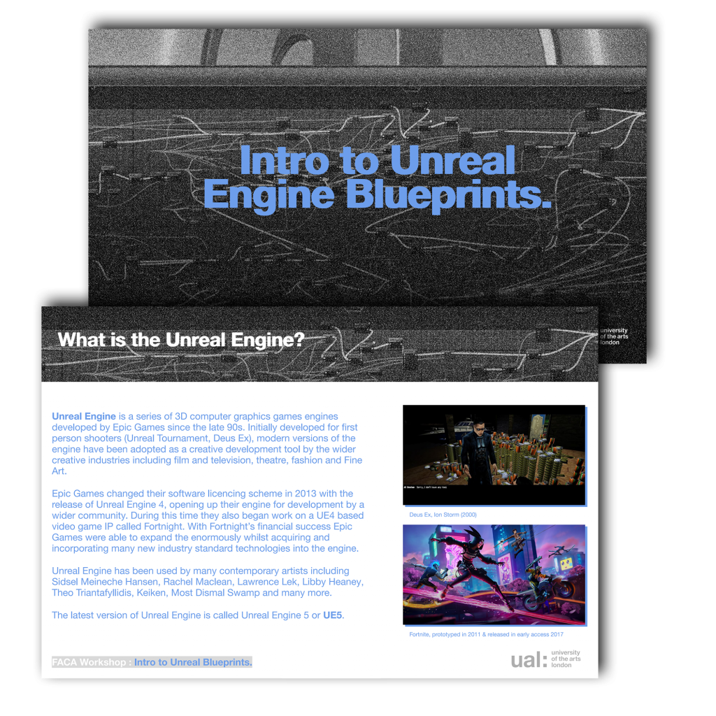 This session is a part of my wider workshop series exploring the videogame engine Unreal Engine, within a Fine Art Context. This session programmed to coincide with the Fine Art Computational Arts World Building unit devised by Ninon Ardisson.